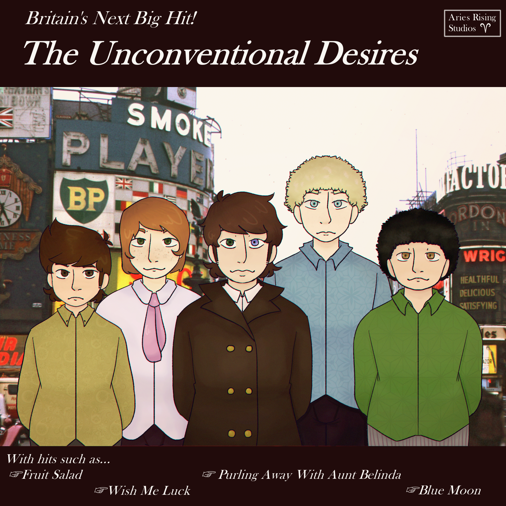 The Unconventional Desires are a fictional hard rock band established in Cambridge, England, in 1966, and would produce music up until 1978. At a meta level, they take particular inspiration from Pink Floyd, The Who, and The Doors; at an in-universe level, they would draw inspriration from the likes of Johnny Kidd and the Pirates, Duane Eddy, and early Rhythm and Blues derived rock from the likes of Fats Domino and Little Richard.